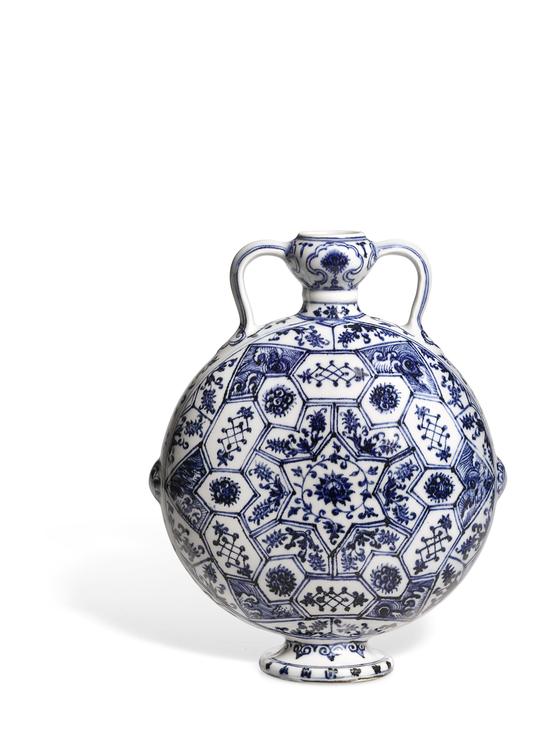 本专场另一十五世纪早期永乐年珍品,则乃明永乐青花花卉锦纹如意耳扁壶。 本壶器型及纹饰皆启发自中东例作,反映当时中国与中东贸易之繁盛,器身精巧几何纹饰设计, 在中国艺术品上未见先例。 中华艺匠取可兰经上纹饰, 施于圆拱形器腹,融伊斯兰六角星图案入波浪、方胜、莲纹等中式经典纹饰。