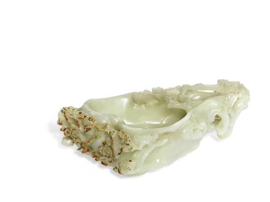 本白玉雕梅树桩式洗制于清十八世纪, 巧融原石自然瑕疵及褐斑于玉雕设计。
