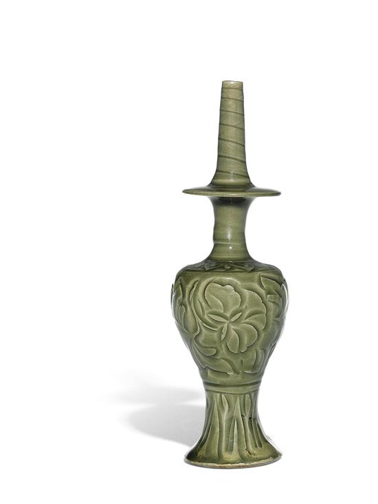 本北宋耀州青釉刻牡丹花净水瓶,制于十一/十二世纪,乃本专场中最罕见拍品之一,曾亮相 1935 年伦敦皇家学院展览, 该展览为历来最重要之中国艺术品展。 现存文献仅记载一例可比,现属波士顿美术馆馆藏,制于同期,与本瓶并不相同,应为独立设计。 佛教画像,多绘观音手持净水瓶,故本瓶亦颇具佛家渊源。 直立式瓷器, 制作及加饰较为费时,烧制时占窑中位置甚多,耀州窑鲜有出品,本瓶即为其中罕例。