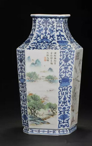 清乾隆青花粉彩开光山水诗文八方瓶高33cm