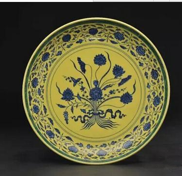 观之此盘,器型规整雅致,通体以黄釉为地,纹饰在明永宣青花图案的基础上加以创新而形成自己的特色,盘心圆形开光内以青花绘一把莲纹,器壁饰以缠枝四季花卉纹一周,花形饱满,青花沉着稳定,尽显皇朝之富贵。盘底白釉莹润,青花双圈内书"大清雍正年制"二行六字楷书款。该器为雍正时期同类器中规格较大的品种,且黄釉地青花更比白地青花名贵。