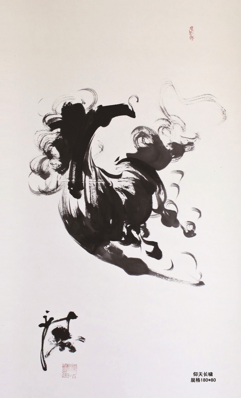 他画的马,既注重写实,又传达精神,笔墨淋漓,简练潇酒,赋予了张扬的生命力。他尤其强调笔势和笔法的活力,在画面的排列组合中寻求变化与统一、协调与对比的一张一弛,一曲一伸,以求得造型的节奏感与韵律感,如同读抑扬顿挫的古风,豪放婉约的词曲,以内在的细节考究显示出图案之美理性之美和形式之美。