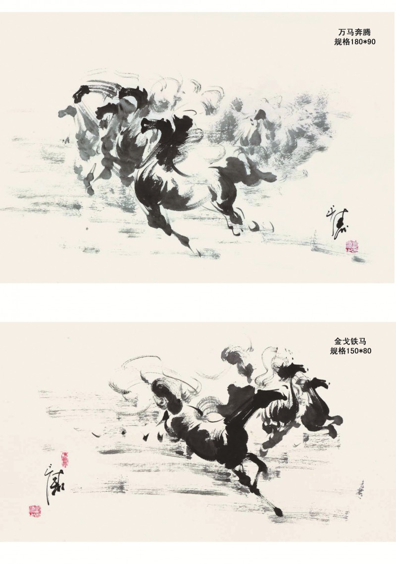 刘永涛笔下创作的《八骏图》、《百马图》等作品中,一匹匹奔马高头、长腿、骠悍、勇猛,奋踪扬蹄,在广袤的大草原上飞驰,骏马英姿,神态各异,形神毕肖,仿佛要破纸而出,如同一首大气磅礴如交响乐,推动着民族复兴的历史滚滚向前。这也是作者追求理想,向往自由的象征。常年的军营生活,尤其是刘永涛在内蒙古大草原的经历,让他成了马的知己。