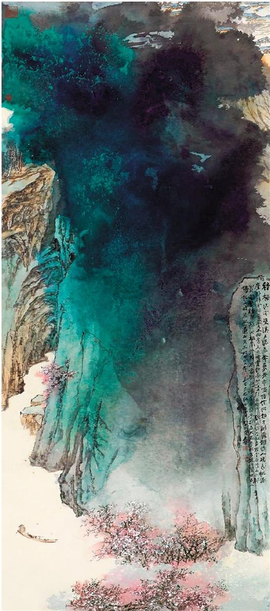 据悉,这次香港苏富比推出的《桃源图》与张大千生平最后巨制《庐山图》创作时间相仿,两者皆精心绘制,尺幅大于一般作品。拍品虽题于“壬戌嘉平月”(1983年初),但并非一时间写成,应是反复思量斟酌,尽心竭力为之。全幅高约七尺,上方几近满画,以极厚重的石青石绿等矿物颜料,反复泼洒,层层堆叠。从该画中可看出大千泼墨和泼彩的结合可谓驾轻就熟、炉火纯青。画面下方留白,近岸处醒以桃花数丛,嫣红粉嫩,烂漫怒放,清香袭人,旁有渔翁钓艇,似入桃源之境,这样的景象也是张大千毕生所求。