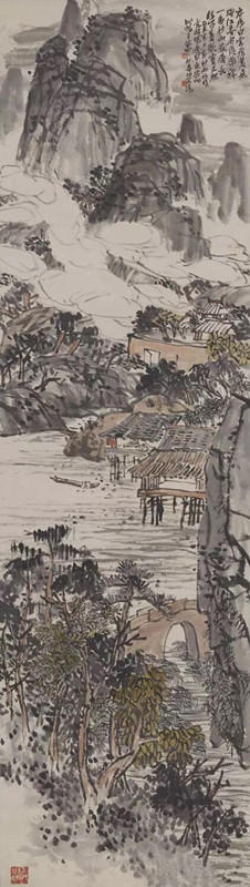 在潘天寿那里,山水画变成民族文化心灵和历史情感的寄托,在趣味与格调上体现出了时代雄强气象。《云谷菱歌》呈现出他早期作品的面貌,构图饱满壅塞,尺幅巨大,气势奔放,直抒性灵,且笔墨颇得吴昌硕神韵,浑厚凝重,金石味足。他虽比吴昌硕小五十余岁,却在魄力气度上与其颇为接近。1923年春,26岁的潘天寿流转于上海教事绘画,经老友诸闻韵的介绍认识了吴昌硕。吴昌硕对潘天寿赞赏不已,称其“天惊地怪见落笔,巷语街谈总入诗”。