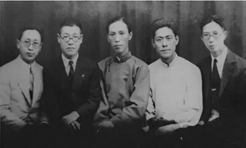1932年由潘天寿发起成立“白社”(左起张振铎、潘天寿、诸闻韵、张书旂、吴茀之)