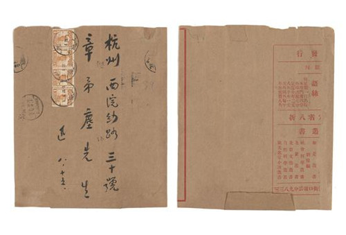 此信封写于1928年8月15日,信封是由与《语丝》有关的校样纸裁成。背面为“语丝”等字,正面为川岛在杭州西浣纱路的住址,虽是小物,但却因集合了鲁迅的工作与友谊而弥足珍贵。信的内容与当时鲁迅主持的期刊《奔流》、《语丝》密切相关,其中最常被引用的为其谈及与刘半农关系,同时提及郁达夫、田汉、郑奠、沈尹默和当时负责《语丝》出版发行的翻译家李小峰等人。此外,此信亦记载鲁迅托川岛从民国著名书店杭州抱经堂书社购买古籍《奇觚室吉金文述》一事。