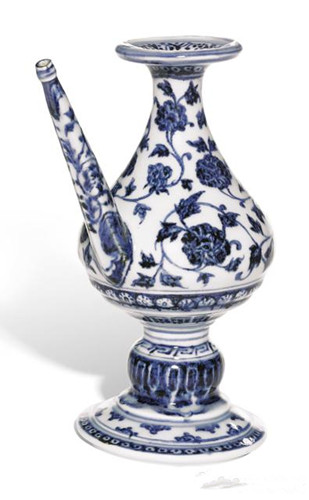 此青花缠枝牡丹纹净水瓶器型依据一金属器雏本,与藏传佛教具有渊源,本瓶应为永乐帝宫廷礼佛宝器,仅用于重要仪式,乾隆年间为清宫收藏。