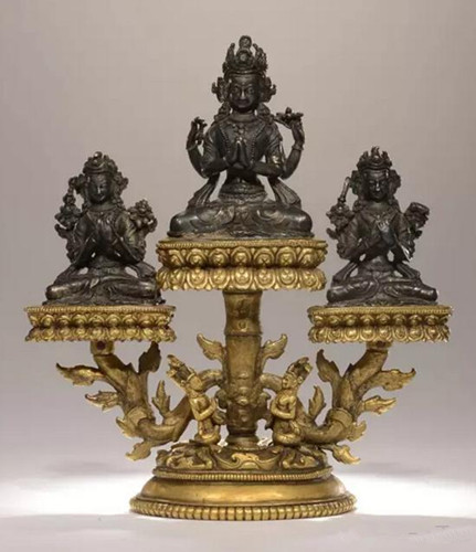 西藏16-17世纪(扎什伦布寺风格)银质三怙主(铜鎏金底座)