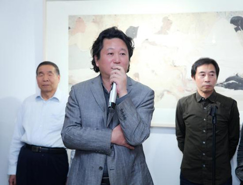 作为学生们的导师及展览学术指导,李孝萱先生为大家介绍了此次展览的情况:“首先,我代表全体同学为向这次展览付出努力的正观美术馆馆长孙志中先生,天大云华美术馆馆长石磊先生、林玉祝先生,以及所有的工作人员表示感谢,没有你们的努力,就没有这次展览的完美呈现。这个展览筹备的时间非常的仓促,20多天以前,我来北京跟孙馆长聊起来我的学生,我说我最大的愿望就是给我的学生办一个展览,他们画画很辛苦,也默默无闻。然后孙馆长跟石馆长商量了一下就敲定了这个展览。展览的题目是我自己敲定的,所谓“同心合意”,就是我们是一条心,是一条路上的人,是一个团结的整体,我们永远在一起。我们所探索的当代水墨画,和世俗的水墨画不太一样,它需要有强大的忍耐性。我们的工作室筹建初期非常的艰难,从最初我一个人教书,到后来队伍逐渐壮大,在教学上老师们非常严谨,对写意人物画的要求也是身体力行,我们实行了一个教学大纲:第一,在一个有思想的框架里去解决技术问题,这是我们工作室最主要的宗旨。思想每个人都有,但是怎么让它单纯化、趣味化,是我们一直追求的;另外一点,在异质文化完全重塑我们的时刻,各种主义的压迫让我们丢失了家园感,我们要保证一种积极的民族立场,呈现在大纲上就是我们一定要在中国画语言内部去寻找突破。这么多年来,我们培养了不少学生,他们一直在非常诚恳的对待艺术,每次看他们的画我都非常感动,我的学生们都非常的可爱,非常的朴素,非常的诚恳,谢谢大家。”