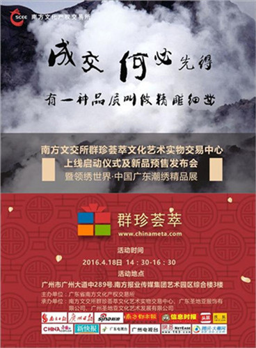 广东省南方文化产权交易所是广东省委、省政府批准设立的综合性文化产权交易服务机构,是广东省文化强省建设规划项目十大重点扶植的项目之一,拥有良好的社会声誉与公信力,力求打造成为立足南方、连接港澳台、服务全国、面向世界的文化产业权益性资本市场。澳洲圣地亚金鼐文化控股集团有限公司致力于中国潮绣文化的发展与传承,将潮绣国际化作为公司使命,扎根于潮绣工艺、宏扬中国民族潮绣服装、潮绣艺术,全力打造潮绣“非物质文化遗产产业第一品牌”。2015年在圣地亚的推进下,中国非遗文化海外首次上市澳洲SSX悉尼证券交易所,成功敲响中国非遗文化在海外上市第一股锣声,使中华文化瑰宝在海外大放光彩。为推动岭南文化发展的共同使命,南方文交所与圣地亚公司达成强强联合,将共同为强化岭南文化的多元发展、岭南文化走出世界做出努力。南方文交所群珍荟萃文化艺术实物交易中心正是在这样的社会文化背景下破茧而出。
