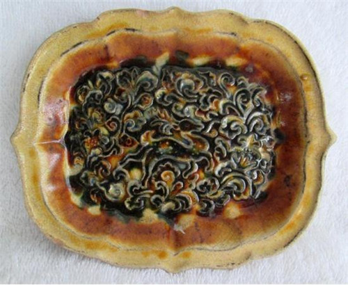 此辽三彩釉陶器胎质细软,呈淡红色。阳文印花花鹿荷叶纹,釉色娇艳光洁,富契丹民族的风格。辽三彩多用黄、绿、褐三色釉,器型中的方碟、海棠花式长盘、鸡冠壶、筒式瓶等,富有契丹民族的风格。其中赤峰缸瓦窑烧造量相对大一些,所烧三彩釉陶器胎质细软,呈淡红色,釉色娇艳光洁,可与唐三彩媲美。装饰手法有印花、划花两种,大凡盘、碟采用阳文印花,琢器采用划花。与唐三彩的区别除胎土不同外,主要是辽三彩中无蓝色,施釉不交融,釉面少流淌。