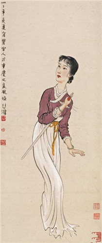 此作表现费宫人持剑欲刺虎一幕,其屈膝站立,上身微倾,将剑隐蔽在胸前,并警觉地扭头凝听屋外响动。画家细腻地刻画了费宫女婀娜的体态,唯神情大义凛然,似乎暗合了袁枚在《费宫人刺虎歌》中的表现手法:“妾手纤纤软玉枝,事成不成未可知。妾心耿耿精金炼,刺虎犹如刺绣时。”强化了女子的柔弱与刚毅之间的反差。画中费宫人的脸庞、紫衫白裙,甚至是翡翠的耳坠和手镯,均与《落花人独立》中的女子如出一辙,眉眼与画家这一时期的爱人神似,另有一说此种开脸是结合了画家本人的面相特征,但无论如何,可以确定的是,这些仕女的创作与画家的心境有莫大关系,是其情感的宣泄和寄托。人物的造型、线条以传统的国画手段勾勒,而五官和手的刻画、脸部和裙子的渲染,则融入西画技巧,因此在柔美的身段之外,透出一股英气,这在中国近代仕女画中独树一帜。右下角钤“真宰上诉”压脚印,足证画家对此作的满意程度。