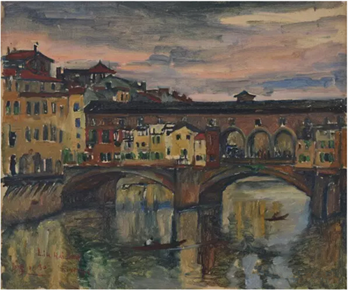 刘海粟对于艺术创作中个体精神情感的强调,使得他在欧洲期间的写生创作有相当一部分是以人文历史遗迹为对象的,这其中往往夹杂着中国传统文人的怀古幽思与近代知识分子对于西方人文主义启蒙思想的热切向往,正如傅雷在刘海粟画集序言中所写的那样:“他徜徉于罗马郊外,在佛朗伦画他凭吊唏嘘的古国的颓垣断柱、画二千年前奈龙大帝淫乐的故宫和斗兽场的遗迹。在翡冷翠,他怀念着但丁与倍屈的神秘的爱,画他俩当年邂逅的古桥。”这座古桥名为维基奥桥,始建于古罗马时代,是翡冷翠保存下来的最古老的桥,同时因曾经演绎了诗人但丁与贝亚特丽丝之间一段凄美的“廊桥遗梦”而著名。想必刘海粟亦如傅雷所言,在面对这座横跨于阿尔诺河上的廊桥时,深深地被那种“神秘的爱”所触动,才创作了这幅颇具浪漫气质的《翡冷翠》。
