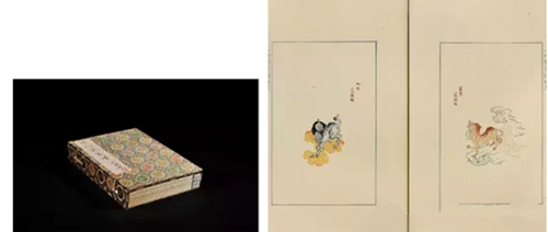 《北平荣宝斋诗笺谱》为民国二十四年(1935)荣宝斋饾版拱花套色印本,内收是谱内收齐白石、溥心畲、吴待秋、徐操、颜伯龙、王梦白、张大千及古代名笺小品二百幅,色彩艳丽,淡雅相宜。绯红绫面,甚为悦目。