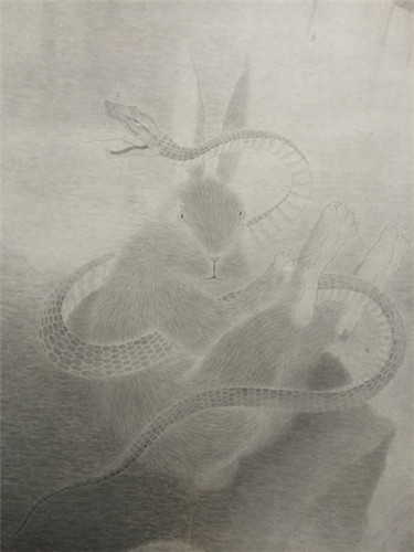 “我尽量不用人的视角去看兔子,而尽量用兔子的视角去看兔子。”正如艺术家所言,唯有兔子看兔子才会有的感受;人视角下的“小”动物被呈现在画面中却是如此的自尊,可以与人类平视而对望着。在他的描摹下,万物皆有灵。置身于超现实的大尺幅动物“肖像”前,其庞大的体量和画面的陌生感会另观者重新审视自己。他如匠人般用数十万道细密的笔触和水墨的层层浸染,让这弱小的动物跃身为画面上体量非比寻常、神情丰富而难以揣测的硕兔,一种奇特的、触觉般的视觉感也得以从画面中流淌出来。