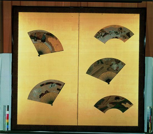 纸本金地设色江户时代(17世纪)此图是用十一幅金箔地扇面剪贴而成的作品。这组屏风极有可能是后人将宗达画在其他屏风或者隔扇等大画面作品上的扇面剪下,重新裱装而成。作品中各幅扇面的选材均为日本传统绘画之经典题材,但经过宗达之手而得以提炼和升华,构成了一幅幅崭新的力作,是宗达现存扇面图中的杰作。