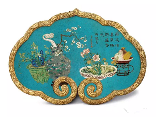 此挂屏造工精湛上乘,色彩悦目清丽,构图疏朗有序,配合耀眼夺目的鎏金铜框,尽显非凡卓越的皇家气派。北宋时,徽宗命大臣编撰《宣和博古图》,收录宣和殿收藏的青铜古器。后人追慕徽宗思古之幽情,开始作画各类铜、玉、瓷等古器,并称之为「博古图」,以明博古同今之志。博古图开始成为中国艺术品上常见的纹饰,亦多出现在文人书斋中陈设的挂屏,但在掐丝珐琅器上则不为多见。本掐丝珐琅挂屏,以斑烂绚丽的色彩描绘各类珍贵古器,再镶在金碧辉煌的鎏金铜框内,既反映乾隆皇帝作为文人的好古敏求之心,亦显示他作为君王的王者风度。如意云形的掐丝珐琅大型挂屏更是寥寥无几,故本挂屏实数难能可贵的宫廷艺术珍品。