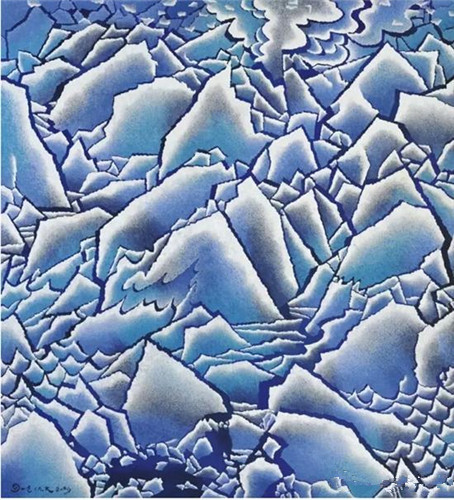 仇德树的“裂变”艺术显然归属水墨画语系,避免了“工艺化”倾向。水墨画是笔墨落宣纸,仇德树的画是宣纸代笔墨,宣纸即笔墨,不仅拓展了宣纸的新的作为空间,而且是对水墨画绘画方式的一种新的探索。水墨画的枯湿浓淡的巧获,在仇德树的裂变艺术作品中主要依赖于撕、磨、擦、雕后的宣纸厚薄、遮透、连断和“纸韵”的变化。水墨画的线条维系了水墨艺术的魂魄,在仇德树的画中靠“裂纹”加以表现。彩墨画中的色彩是墨色同行,以墨融色,以墨破色,墨色渗化,在仇德树的作品中逆序而上,底色定调,破纸露色,纸磨色显,纸定其色,色随纸变,变中觅光,内含神奇。在宣纸撕裂的边沿处往往具有视觉冲击力,大有“沧海横流”之势,气吞山河的力;在宣纸打磨的细微处往往具有艺术感染力,有各类皴法,有山石的呼吸,有“凝固的柔和的水”和“溶解的碧绿的山”,有“山的笑影”和“水的歌吟”。