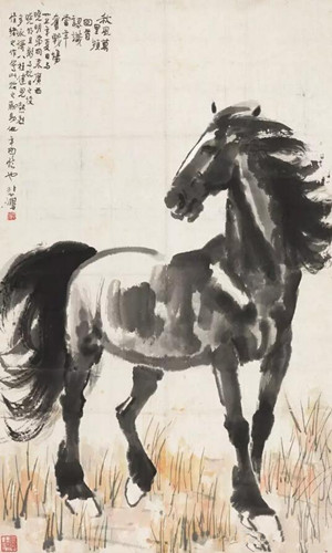 纵观中国丹青史,马是中国人文精神的体现。马寄予了画家对自然界蓬勃生命的赞美,更是华夏民族的图腾。徐悲鸿先生绘马,写实主义功力浑厚,更蕴藏深刻的思想内容和时代精神。留欧“面壁”八年,他攻习油画,生活的困窘使其夜不能寐,将寓意“长寿安康”的名字,改为“悲鸿”,如哀鸣之鸿雁,以警示其心志。他学成回国,提出“古法之佳者守之,垂绝者迷之,不佳者改之,未足者增之,西方画之可采者融之”的“五子诀”,投入拓展艺术教育和实现其改良中国画的宏愿。