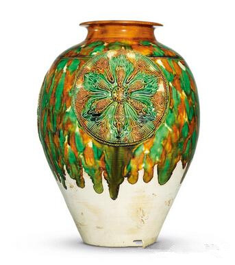 唐三彩贴花宝相花纹罐高30公分