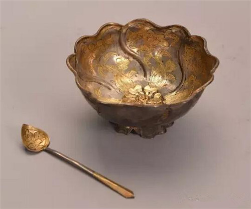 鎏金刻花葵口碗D9.4cm,勺L8.6cm
