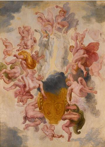 这幅典型的鲁本斯油彩素描作品,自1930年起由鲁本斯作品收藏名家奥古斯特?诺伊尔伯格的家族后人收藏至今。此画是一幅天花壁画的摹本,原作是意大利画家普里马蒂乔为法国枫丹白露宫的尤利西斯长廊内一间房间而绘制,原画已毁。