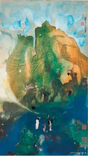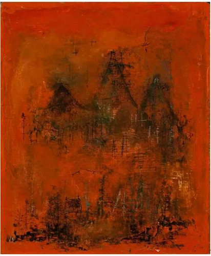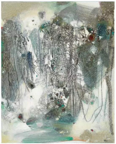《雪霁霜色I》中苍劲有力且自由奔放的线条不仅令人想起西方抽象表现主义的行动绘画,其中所体现东西艺术融合的精髓,更源于唐宋山水画与诗词的内蕴精神。朱德群通过流畅洒脱的笔法,营造出由「点、线、面」构成更甚以往的空间感构图。充满律动的线条和肆意泼洒的彩点,赋予画面瑞雪纷飞的效果;点缀于山石间的红点,犹如在凌寒独开的梅花,给画面带来勃勃生机和跳跃的视感。画面中纵横交错的线条,重现了唐宋山水画中山石盎然而立之景,观者彷如置身于巍峨的雪峰,感受雪景山水恬淡宁静、崇高而空灵之境。