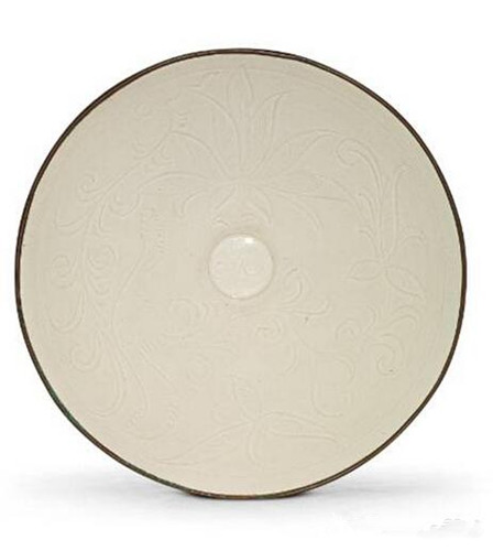 斗笠盌因倒置时形似斗笠而得名,该器形线条简练优美,充分体现了宋人崇简尚雅的审美情趣。斗笠盌为茶器,宋人饮茶于制茶、选器都颇有讲究,更雅好斗茶。带刻花装饰的定窑斗笠盌颇为难得,盖因于斜直薄壁上施加刻划易使器壁烧塌。本件斗笠盌敞口尤甚,而器腹较浅,内壁以长斜刀配合直刀刻三朵形态各异的莲花以及一朵荷叶,线条利落,流畅如画,堪与定窑黑釉鹧鸪斑斗笠盌并称临宇山人定窑收藏中的双璧。