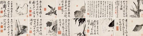 《个山杂画册》是其中年至晚年的创作历程。以现存九开所绘海棠、块石、山岩、灵芝、八哥、玉兔、鲫鱼、瑞香花及芭蕉等来看,既不改其早年皴擦等画法的习惯,亦呈现了晚年的画风面貌。作为开创大写意花鸟水墨画先河的奠基人,八大山人此作是其风格、名号使用的转折点,更是他书画艺术中不可替代的一组作品。