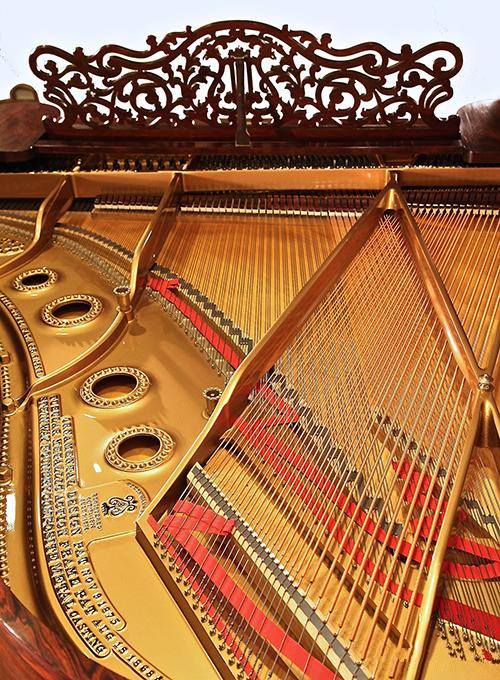 此拍品制于1879年,为维多利亚风格,其中纯手工引人注目的细节的雕刻,凹槽的琴腿和玲珑剔透雕刻的音乐谱台,由花鸟图案突显出传统音乐符号。本琴材质采用的是钢琴领域中最昂贵且已绝迹的巴西红木,此木纹理花纹漂亮木质坚硬。该琴的状况极佳,演奏声音纯正,韵味陈熟,色彩丰富,高音清脆明亮如银铃一般。并保有原始的象牙琴键,是演奏收藏之佳品。