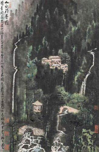 《山水清音》创作于1988年,是李可染晚年的代表作之一。画中的清音阁位于四川峨眉山牛心岭下,为峨眉山胜景之一,李可染以全景式的画法将其尽入画中。他在题跋中称:“昔年曾在此写生,兹图其大意”,可能是指1956年李可染任中央美院中国画系教授时,与陈大羽等人的长途写生之旅。当时他们曾赴江浙、入四川、过三峡,亦到清音阁写生,共创作画作200幅。《山水清音》曾在2008年4月8日的香港蘇富比春拍中亮相,最终以615.15万港元成交。