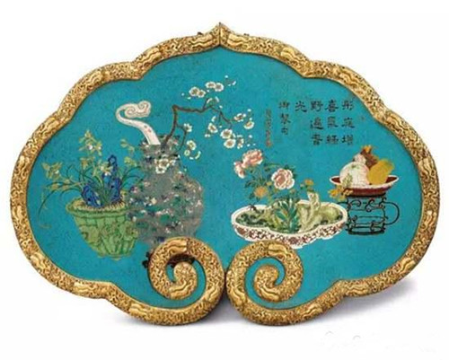 挂屏上的诗为乾隆御题,题字以于敏中书法为蓝本,全诗记录了乾隆皇帝与皇太后共度新春佳节,并祝福太后褔寿双全。此诗成于乾隆25年,而来年便是皇太后70岁大寿,从挂屏的形制来看很有可能是乾隆为庆祝母后生日的贺礼。挂屏上饰以《博古图》,早在北宋时徽宗命大臣编撰《宣和博古图》,收录宣和殿收藏的青铜古器,后人便开始画各类铜、玉、瓷等古器,并称之为《博古图》。由此,《博古图》成为中国艺术品上常见的纹饰,亦多出现在文人书斋中陈设的挂屏,但在掐丝珐琅器上则不多见。而如意云形的掐丝珐琅大型挂屏更是寥寥无几,故这件挂屏是难能可贵的宫廷艺术珍品。