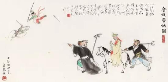 关良(1900-1986) 金猴击妖图 纸本镜心 备注:芦芒上款并题本幅。 尺寸:34.5×70cm