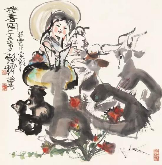 程十发(1921-2007) 接喜图 纸本立轴 1977年作 备注:庄霄上款。 尺寸:69.5×68.5cm