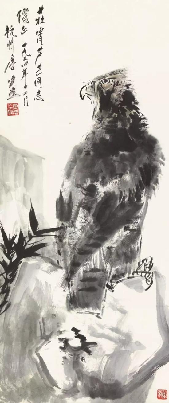 唐云(1910-1993) 雄鹰 纸本立轴 1974年作 备注:1.唐云自题签条。 2.庄霄、芦芒上款。 尺寸:96.5×40.5cm