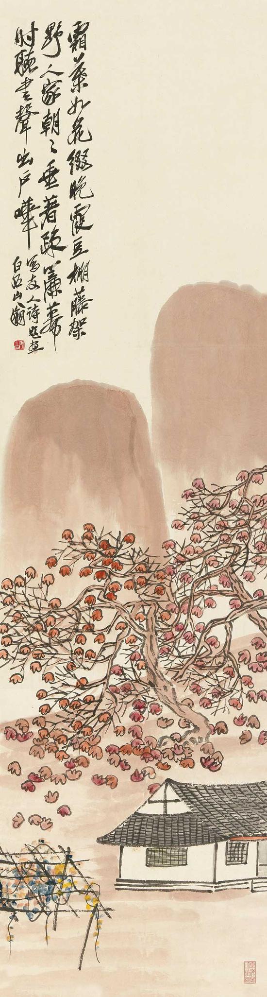 款识:霜叶如花缀晚霞,豆棚藤架野人家,朝朝垂着疏帘幕,时听书声出户哗。写友人诗题画。白石山翁。