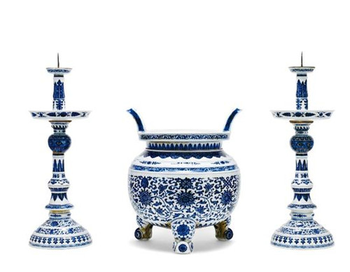 清乾隆 青花缠枝莲托八宝纹烛台、香炉三供