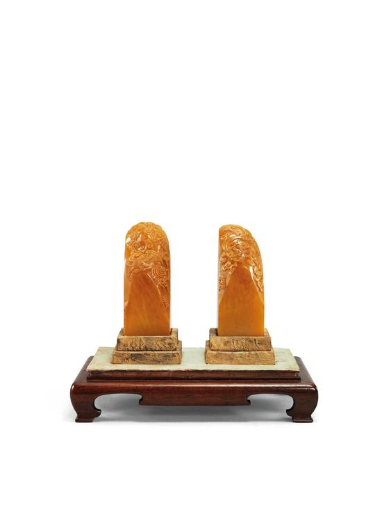本场最高价拍品为清康熙沧门刻恭亲王龙凤田黄对章,成交85,240,000港元/ 11,024,686美元,并取得田黄印章的世界拍卖纪录。