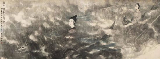据北京保利国际拍卖有限公司官网资料显示,《云中君和大司命》由画家傅抱石于1954年创作。该作品高114cm、宽315cm,画中描绘了屈 原《九歌》中的神话人物“云中君”和“大司命”。画作题识有“云中君和大司命”、“一九五四年九月据屈原今译试写,傅抱石”。印文包括“抱石之印”与“踪 迹大化”。