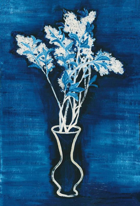 1956年作 蓝色背景的盆花 布面油画