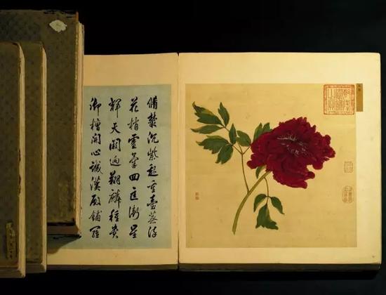 《百种牡丹谱》正是蒋廷锡在宫廷为官时所画并呈雍正皇帝鉴赏的作品。开笔前,蒋廷锡先写好《牡丹百咏》诗句,每种牡丹又分别标明主要颜色、特点,然后正式作画。乾隆九年,即蒋廷锡去世12年时,乾隆皇帝还命宫廷书法家戴临补题百幅《牡丹百咏》诗,可见乾隆追求《百种牡丹谱》巨册诗画完美的用意。《百种牡丹谱》内,乾隆、嘉庆、宣统三代帝王共钤印20次,被清宫藏画大全《石渠宝笈》所收录。