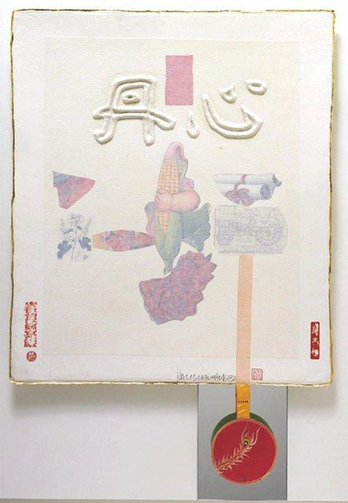 中国的造纸工匠们给劳森伯格带来了不少惊喜,他们研制出两种纸:一种坚硬到可以直立,而另一种则轻薄到近乎透明。劳森伯格利用这两种此前尚未使用过的材质,以及选购自上海海报商店的中式贴纸和图片创作完成了“七个字“(Seven Characters)系列。在其中一幅作品中,纸浆合成了汉字“丹心“,画面辅以抒情而质朴的中国拼贴:一些红色的花朵,一条男童的胳膊抱住一颗丰收的玉米。