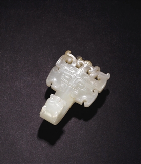 唐宋时期玉带钩,早期仍带有汉代遗风,钩首开始出现禽鸟形、兽面形,但纹饰简练,多浅浮雕,钩钮多矮圆饼形。