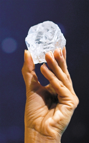 100多年来发现的全球最大宝石级原石“我们的光”(Lesedi La Rona)近日在伦敦展出,这颗大小和网球相当的巨钻稍后将进行拍卖,届时可望以超过7000万美元(约4.6亿元人民币)落槌(右图)。
