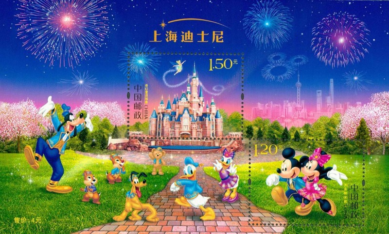 中国邮政定于6月16日上海迪士尼开园日发行《上海迪士尼》特种邮票1套2枚,面值总计2.70元人民币,此外还设计有小全张,售价4元。两枚邮票分别以经典的迪士尼角色米奇、米妮及上海迪士尼乐园中的奇幻童话城堡为主题。邮票由中美双方团队联合设计而成。一枚“米奇和米妮”邮票,面值1.20元,呈现了迪士尼标志性的米老鼠情侣形象,它们身着上海迪士尼度假区主题服饰相伴漫步,服饰设计融合了包括中式立领和牡丹花等别具一格的元素,展现中国独特的人文风情。
