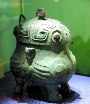 在展品中,有“愤怒的小鸟”之称的鸮卣,在本次展场中成引人注目的明星。鸮是一种像猫头鹰的鸟,卣则是古代盛酒器的一种。本次展出的鸮卣出生于商代,形如两鸮相背而立。首为盖,身为器皿,翅膀为提手,圜眼勾喙,盖中央置四阿顶方柱钮,铸有四足,全身饰以夔纹,融线雕、平雕、凸雕工艺于一身,神情威风,是商代不可多得的青铜珍品。