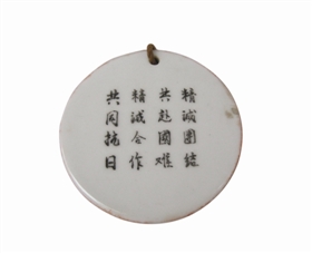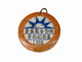 总之,这枚“湘鄂会战义卖募捐纪念章”就是在这样一种历史时期背景下的产物,当时为了全力支援抗日,各地开展了一埸轰轰烈烈义卖募捐的群众活动,这枚纪念章,就是当时政府制作发放给那些义卖捐献者作纪念的。因此这枚瓷质纪念章,在海峡两岸期盼和平统一的今天,就更显现出一种特殊的政治意义和收藏价值。