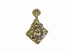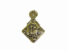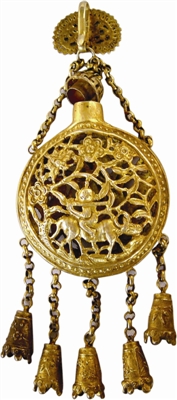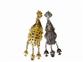 香囊的材质有多种,而以丝棉织品占绝大多数,但能流传下来的当属金属制品居多了。如图1所示这对寿字香囊,一为铜质,一为银质。铜质香囊正中间的盖子上镂雕了一个寿字,四面各有一只蝙蝠,意即福寿双全,完全是一个吉祥的含义。而银质香囊由于表面氧化严重,渐趋发黑。笔者也曾收藏过几枚银鎏金的香囊。