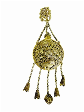 在笔者收藏的诸多香囊中,件件形状不同,个个花式各异。有圆形的,心形的,球形的,柱形的,还有扁桃形的等;其花纹有动物的,花卉的,还有人物的等等;大的重一百多克,小的重一二十克。无论是何种纹饰,何种形状,无论是大是小,件件制作精美,寓意吉祥,体现了匠人的高超工艺水平。特别是香囊的主体部分,既要镂空,又要在方寸之间雕刻出各种花纹,难度很大。如这件银鎏金鹤鹿同春香囊(图2、3),一面主题纹饰是仙鹤,另一面是一头昂首的鹿。鹤、鹿的嘴里各衔一枝灵芝,形象生动。中间为空心,以放置香料,方便随身携带。两面还雕有法螺、棋盘、蕉叶等吉祥纹饰。香囊的盖子上端置挂钩,以银练相连。为使挂钩好看,更具装饰性,匠人独具匠心,穷其工巧,在钩的正面焊接了一块银片,并在上面镂雕了蝙蝠展翅的精美图案,活灵活现,栩栩如生,加上金水足,既美观又吉利。